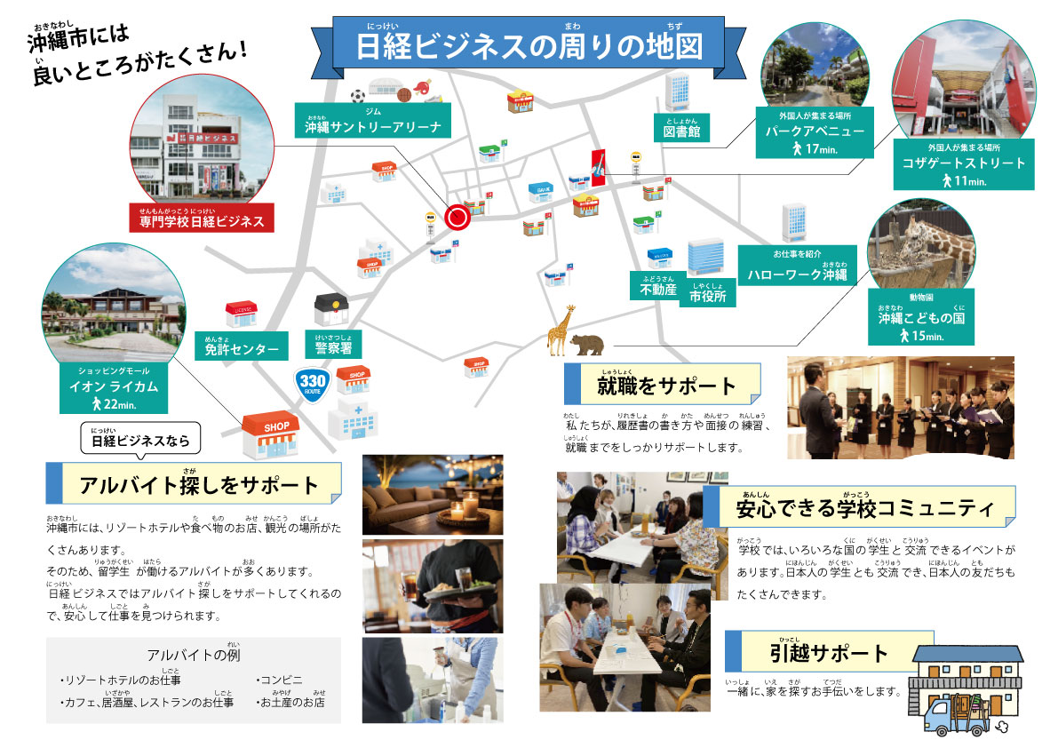 学校は沖縄県で2番目に人口の多い都市である沖縄市にあります。米軍基地もある地域で外国人向けの飲食業やホテル、コンビニエンスストアなど、アルバイトとして留学生を受け入れている店舗も多数あります。学生それぞれのレベルに合わせたアルバイト先の情報提供も行っています。